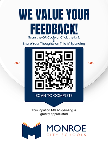 Monroe City Schools needs your input on Title IV spending. Please take a brief 2-3-minute survey on Title IV spending for our district. Click the link to provide your feedback https://forms.gle/1EAnvy3gXR8ZN6rZ9.